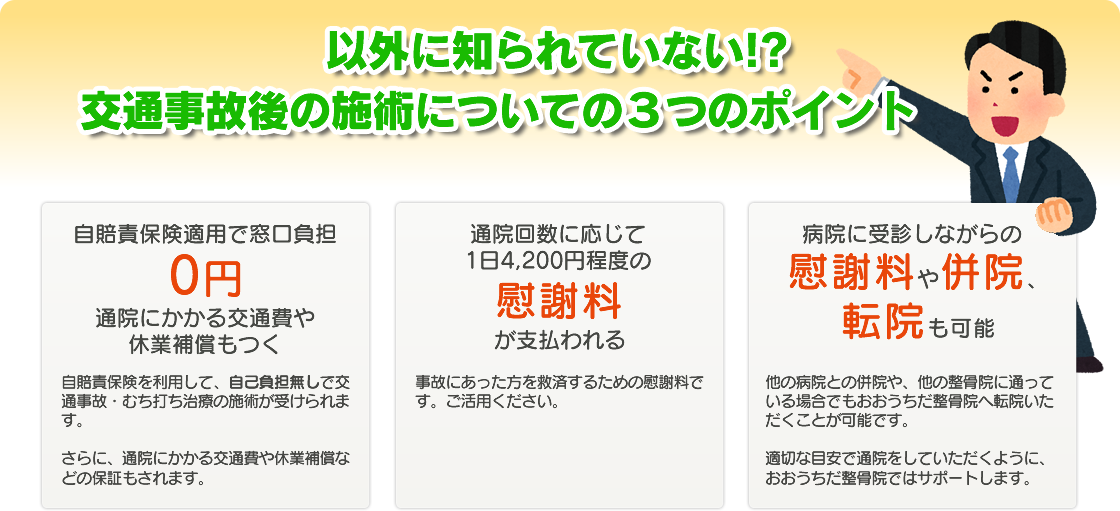 飯塚市で交通事故治療実績No.1の「おおうちだ整骨院」は、交通事故患者様に対しての治療実績で表彰されるなど多くの交通事故患者様に来院頂いています。交通事故の後、後遺症を残さないために必要な施術を行っています。整形外科や病院とは異なる角度から事故後の体にアプローチするので、病院と併院される方も非常に多いです。